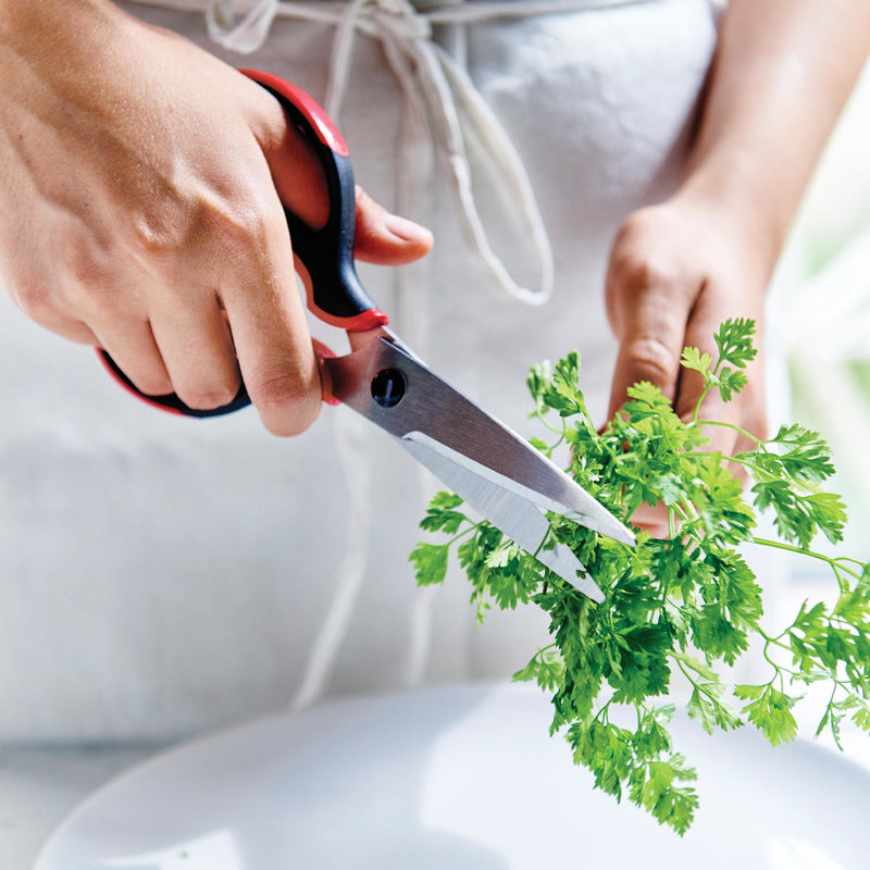 Wat ik zelf zo prettig vind aan deze schaar, is dat hij gemaakt is voor veelzijdig gebruik. In de keuken knip je er verse kruiden mee, zoals bieslook, peterselie of koriander, maar ook sla, spinazie of Chinese kool. De schaar is sterk genoeg om te gebruiken voor het knippen van rauw vlees — ideaal als je kipfilet in reepjes wilt verdelen of speklapjes in kleinere stukjes wilt snijden. Omdat de schaar zo precies werkt, kun je veel netter knippen dan wanneer je een mes gebruikt.