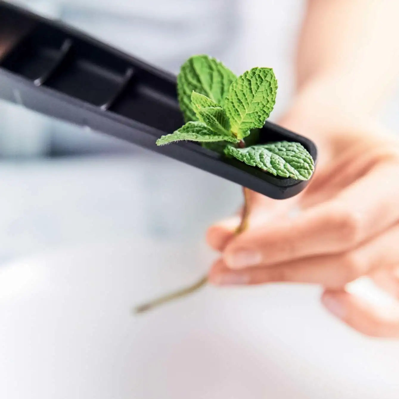 Aan de bovenzijde van de pers vind je slimme afritsgaatjes voor verse kruiden. Trek een takje tijm, rozemarijn of munt erdoor en de blaadjes vallen direct los – een kleine toevoeging met groot gemak. Zo breng je gerechten snel op smaak zonder eindeloos te peuteren met steeltjes. De combinatie van knoflook- en kruidenfunctie maakt deze tool echt veelzijdig: een compacte alleskunner voor elke dag.