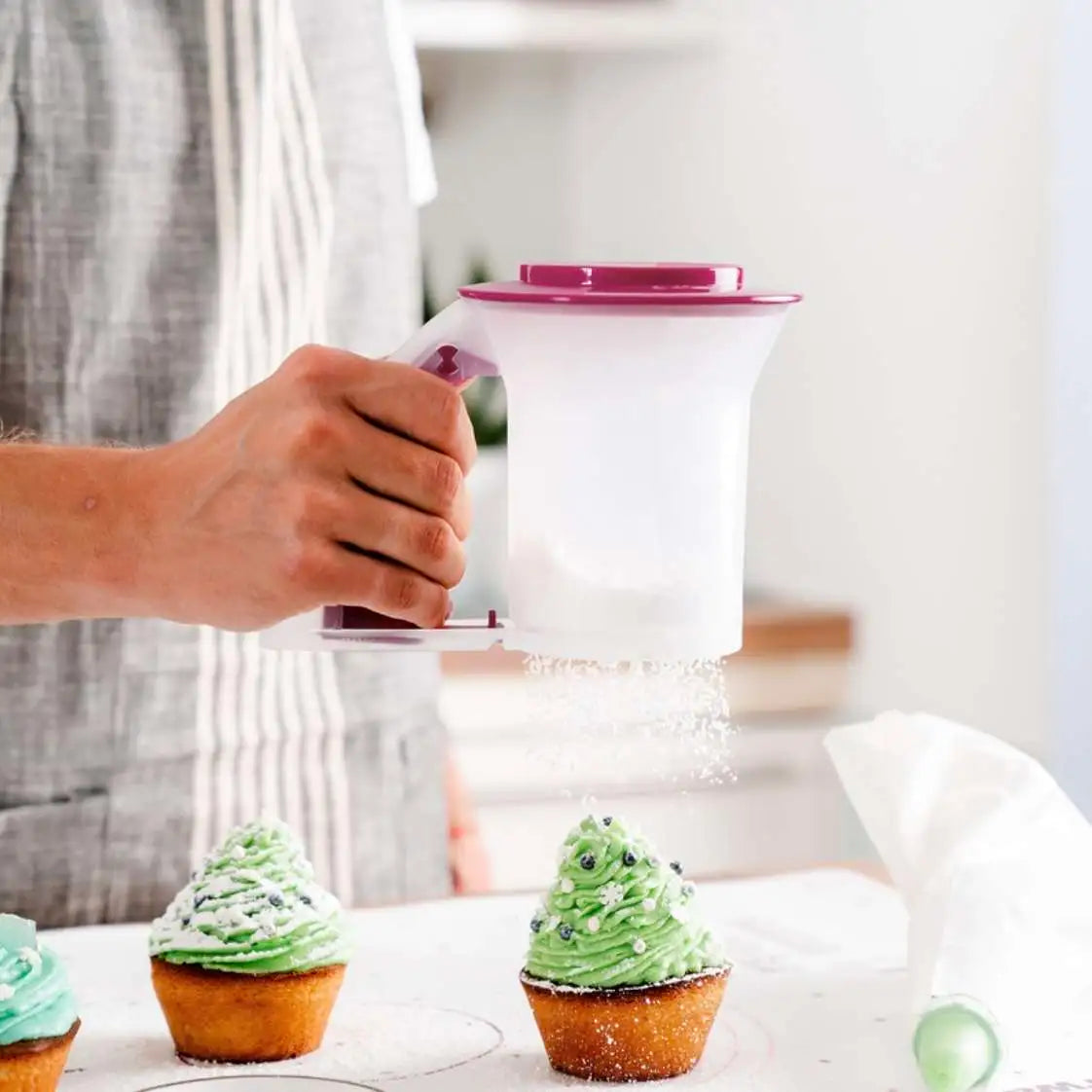 De poederzeef heeft een stevige transparante beker, een brede opening aan de bovenkant en een comfortabele handgreep in het roze. Je vult de beker eenvoudig, sluit de deksel, en daarna gaat het werk vanzelf. Door in het handvat te knijpen, opent de onderzijde een stukje en strooit het poeder mooi fijn en gelijkmatig. Laat je los, dan sluit de onderkant direct, zodat je nooit klontjes of ongewenste vlekken op je gebak krijgt.